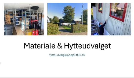 Som medlem i Materiale & Hytteudvalget kan man bidrage med lidt af hvert, om man er god til at søge penge fra fonde, svinge en pensel, formulere en email eller to, afholde en hyttedag eller at man lige præcis kender en som kan reparere telte fra 1980'erne så er alle velkomne her.